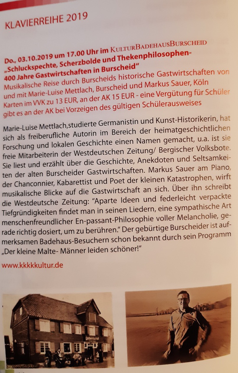 Das Termin-Trio im Herbst 2019: Markus Sauer am 18. September jazzig im Bistro Verde, am 27. September zweifelnd in der Kirche St. Maternus und am 3. Oktober thekenphilosphierend im Kultur-Badehaus Burscheid! Näheres bald an dieser Stelle!