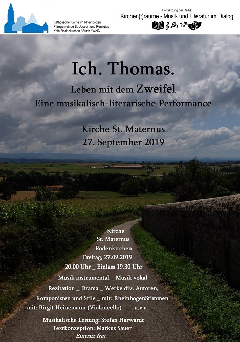 "Die Wahrheit ist eine Pizza Calzone, von einem nicht besonders vertrauenswürdigen Koch gefüllt..." - Künstler und Publikum bringen ihr LEBEN MIT DEM ZWEIFEL in den (Kirchen-) Raum des Glaubens... Sind wir Thomas in einer Zeit der neuen Wahrheits-Weisen? - Es wird emotional. Es weicht ab. Eintritt frei.